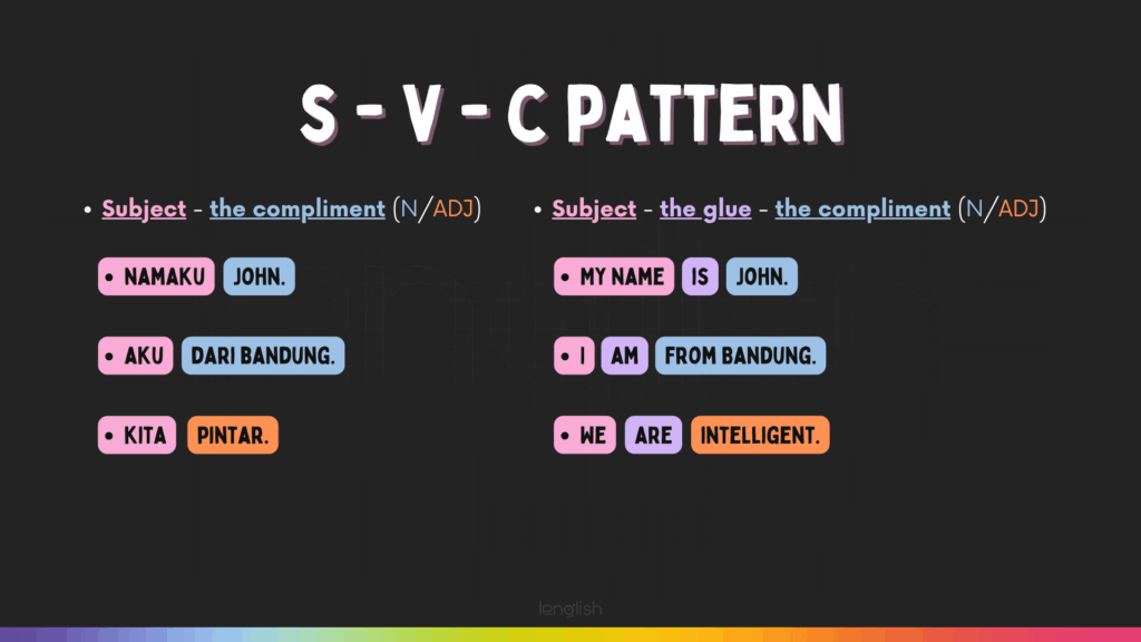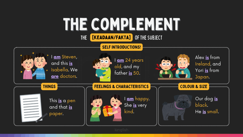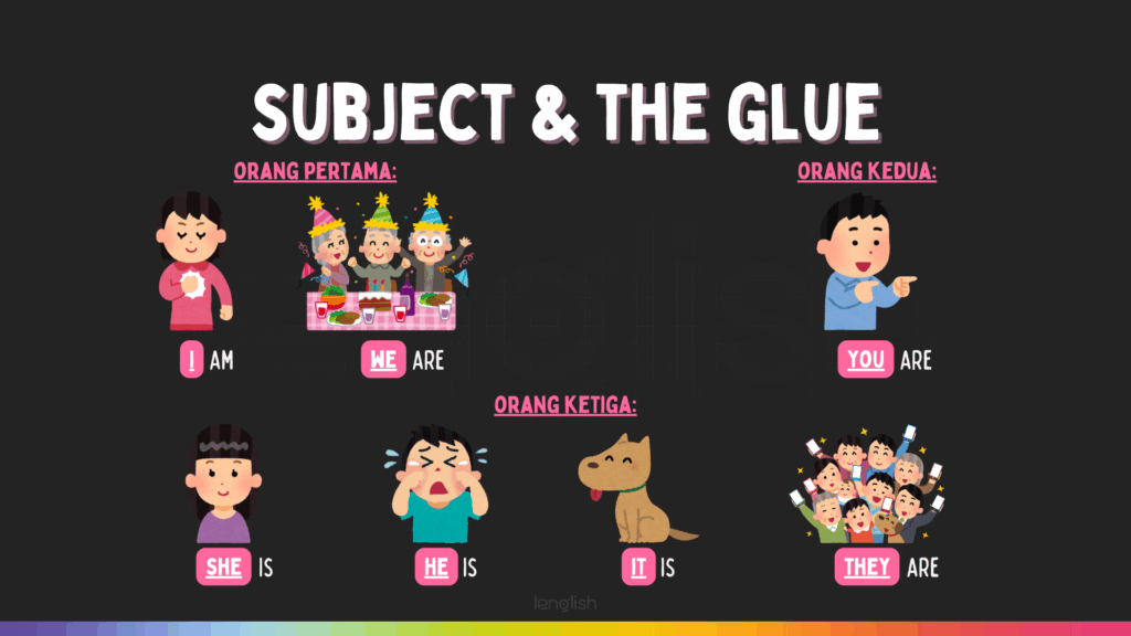 Dalam bahasa Inggris, kita memiliki sebuah kata yang bertugas untuk menjadi GLUE (lem) untuk menyambungkan SUBJECT dengan KEADAAN yang ingin kita jelaskan. Setiap SUBJECT memiliki GLUE yang berbeda: