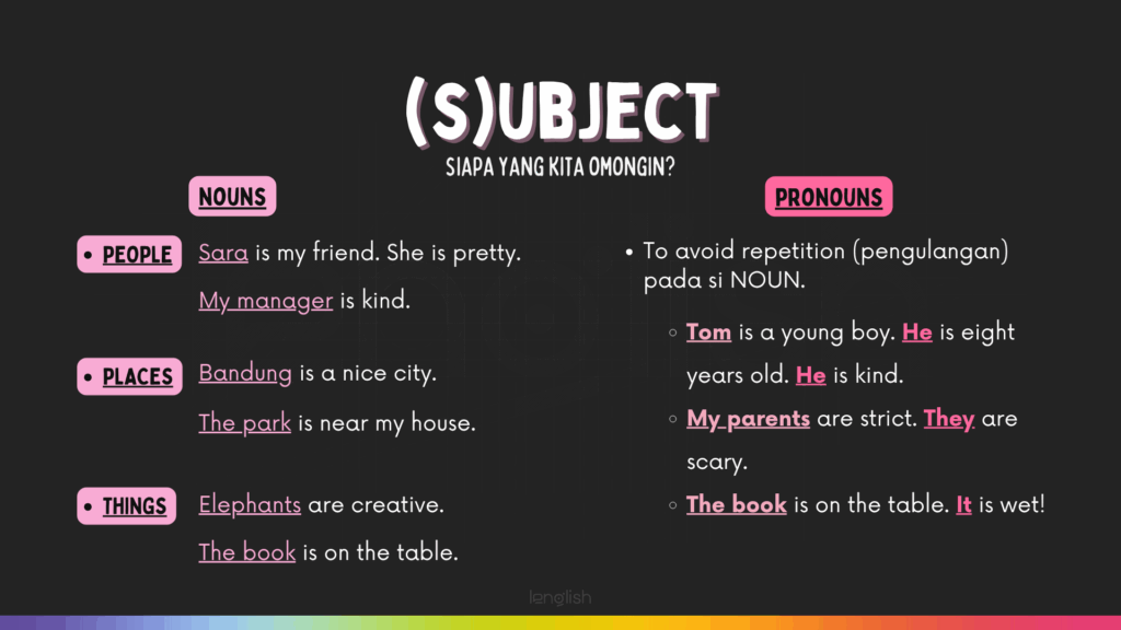SUBJECT dalam bahasa Inggris merupakan apa/siapa yang kita jelaskan dari kalimat tersebut berupa NOUNS maupun PRONOUNS.