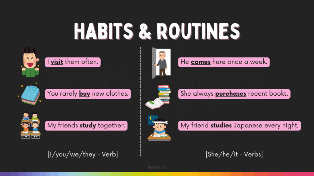 To talk about Habits & Routines, we use Present Simple tense. The main sentence pattern here is quite simple; Subject – Verb 1. However, we have to pay attention to the Subject: